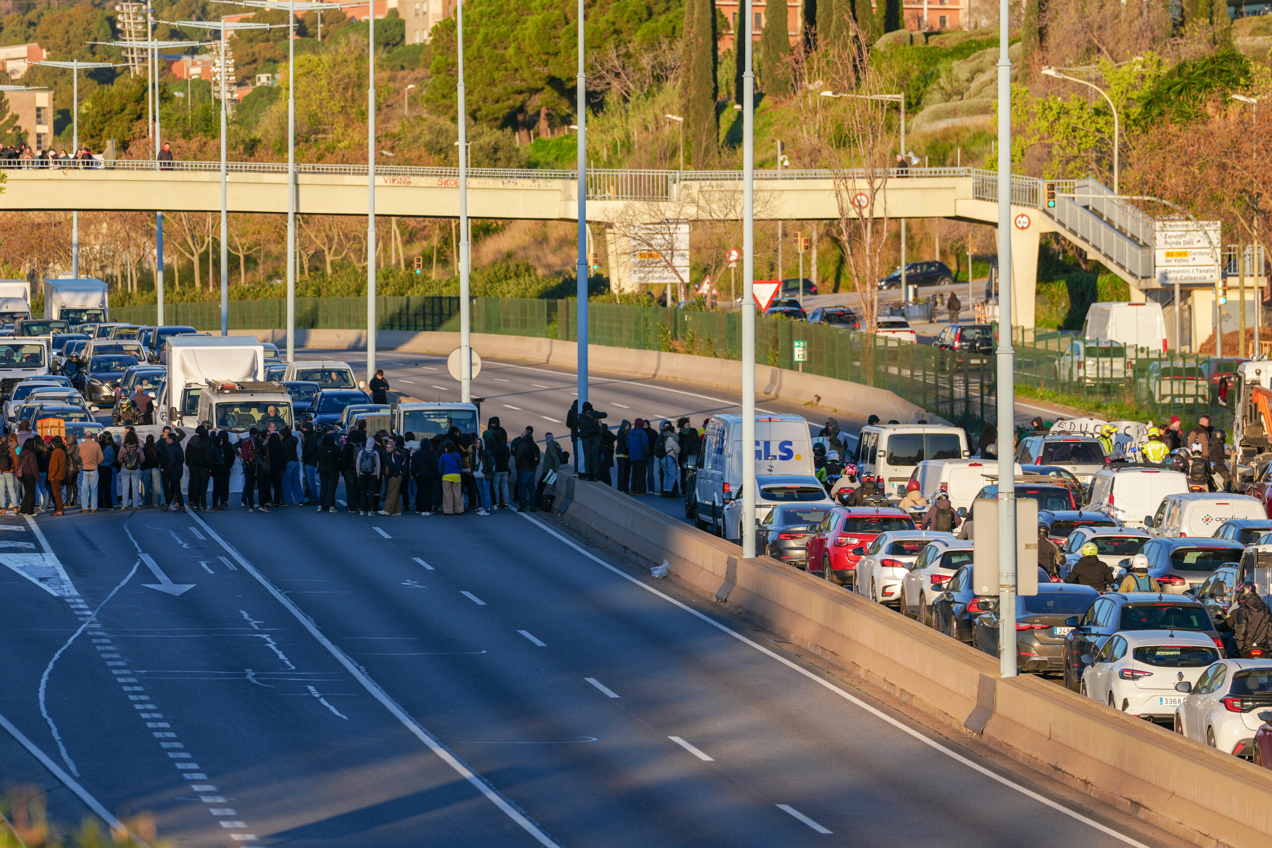 A Badalona, uns 200 manifestants han entrat caminant pel ramal de l’autopista. Passaven pocs minuts de les set del matí i tot el trànsit d’entrada a Barcelona per la pota nord ha quedat totalment bloquejat. El tall s’ha desenvolupat sense incidents i amb només una patrulla dels Mossos d’Esquadra al lloc.