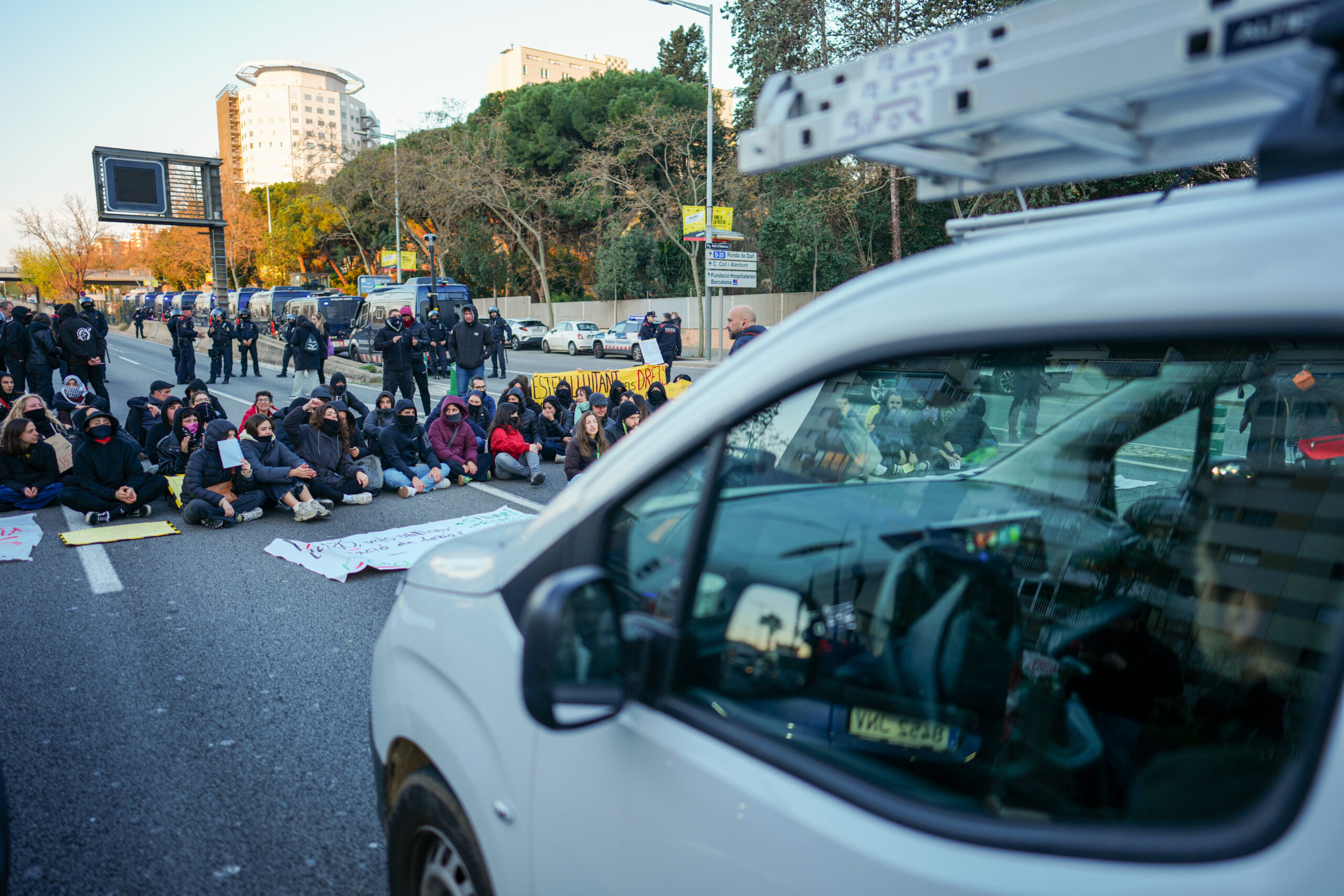 Pel que fa al tall a l’altura de Vall d’Hebron, unes 200 persones s’han desplaçat en metro fins a Montbau i des d’allà han accedit a la ronda de Dalt per tallar-la també en els dos sentits de la marxa, sota la vigilància dels Mossos d’Esquadra. Entre els manifestants, docents però també treballadors del sector del lleure educatiu, que mostraven pancartes en contra de la “precarització” dels sectors i reclamaven la seva “internalització i municipalització”. Els protestants han cantat proclames en contra de l’acord assolit entre el Govern i CCOO i UGT, i han demanat la dimissió de la consellera d’Educació, Esther Niubó, i del conseller de la Presidència, Albert Dalmau. En aquest punt, el tall ha durat també aproximadament una hora, i cap a les vuit ha quedat reoberta la via.