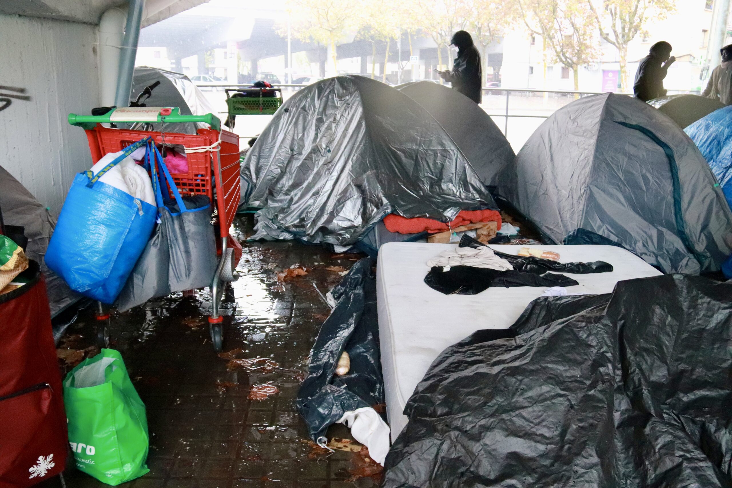 Desenes de voluntaris procedents d’entitats i altres a títol individual s’han mobilitzat aquest dissabte per portar menjar, begudes calentes i mantes als desallotjats del B9. Un centenar de migrants acampen sota l’autopista per aixoplugar-se de la pluja, després que ahir l’Ajuntament els fes desmuntar les tendes que tenien instal·lades a la plaça de davant l’antic institut.