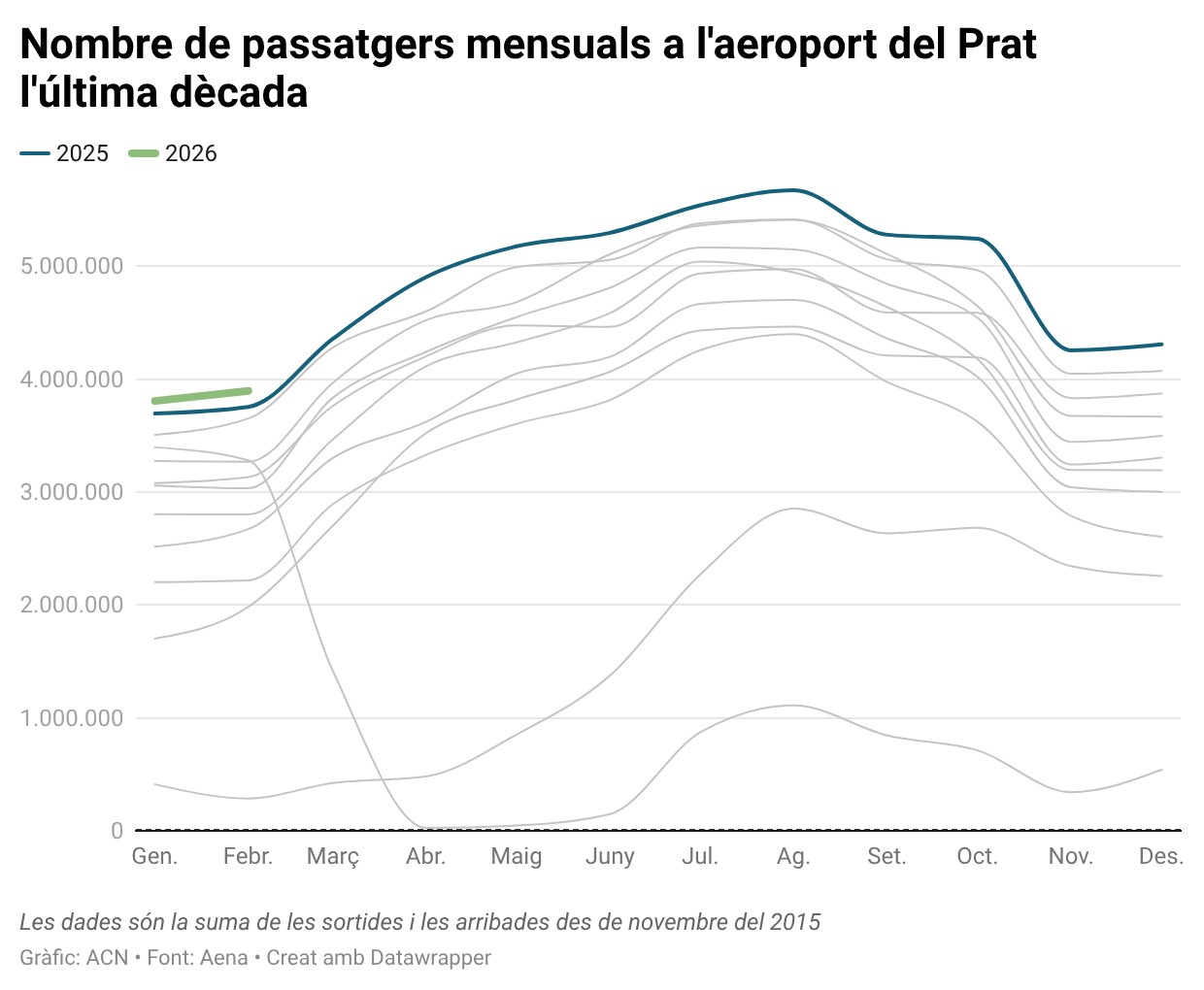 Des de l’inici d’any, l’aeroport ha registrat 7.702.829 passatgers, un 3,4% més que en el mateix període de l’any anterior, i es manté en registres rècord. Pel que fa a operacions, entre gener i febrer se n’acumulen 49.’11, la mateixa xifra que l’any anterior.