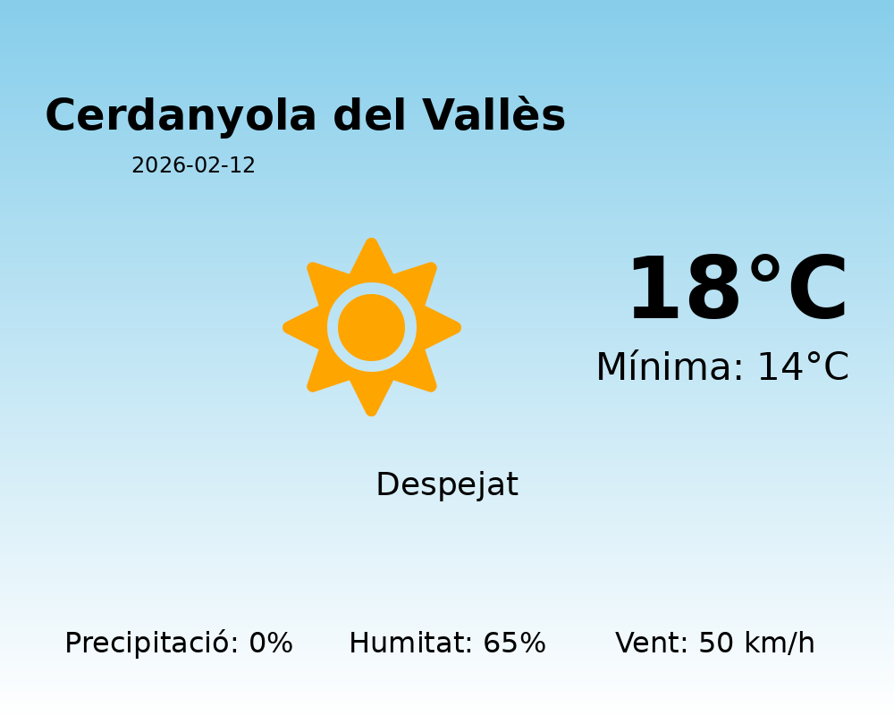 Avui, a Cerdanyola del Vallès, gaudirem d’un dia amb temperatures suaus per a l’època de l’any. La temperatura màxima arribarà als 18°C, mentre que la mínima es mantindrà en uns agradables 14°C, oferint un ambient molt confortable.