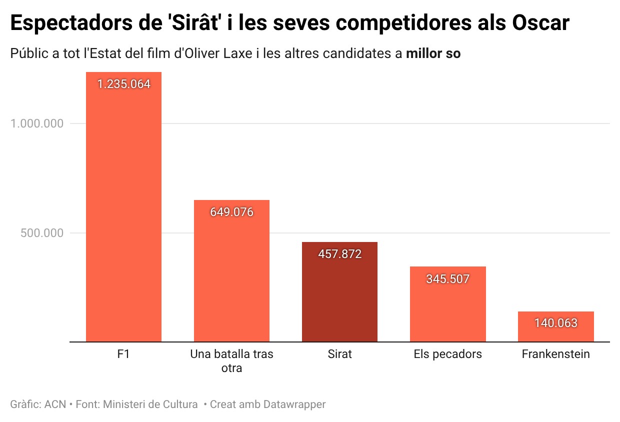 ACN Barcelona – De les cinc nominades a l’Oscar al millor film internacional, la coproducció catalana ‘Sirât’ és la que ha arrossegat més públic als cinemes d’Espanya, més de 457.000 espectadors fins al moment. Esperonada per la promesa de l’Oscar, la pel·lícula d’Oliver Laxe es distancia de l’altra nominada amb més públic a l’Estat, ‘Valor sentimental’, la multipremiada cinta que han vist 185.000 persones. ‘Un simple accident’ (61.800 espectadors), ‘L’agent secret’ (52.000 -estrenada fa tan sols15 dies-) i ‘La veu de Hind Rajab (37.000), són les altres candidates a l’Oscar internacional. ‘Sirât’ també competirà pel premi al millor so, i aquí sí, la seva principal competidora, ‘F1’, ha arrasat a les sales amb més d’1,2 milions d’espectadors.